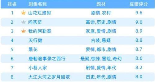 口碑上亦是如斯。天然有《山花烂漫时》以豆瓣9.6分的收获成为近九年国产剧评分第一,但合座来看,本年豆瓣评分朝上8分的剧仅有8部,而2023年则达到了25部。此外,口碑效搪塞不雅众关切的拉动也运行下滑,《山花烂漫时》《大江大河之岁月如歌》都未能以口碑兑换阛阓热度。