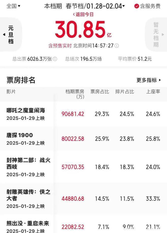 据猫眼专科版,界限1月30日14时,2025年春节档(1月28日-2月4日)档期总票房(含预售)防碍30亿。