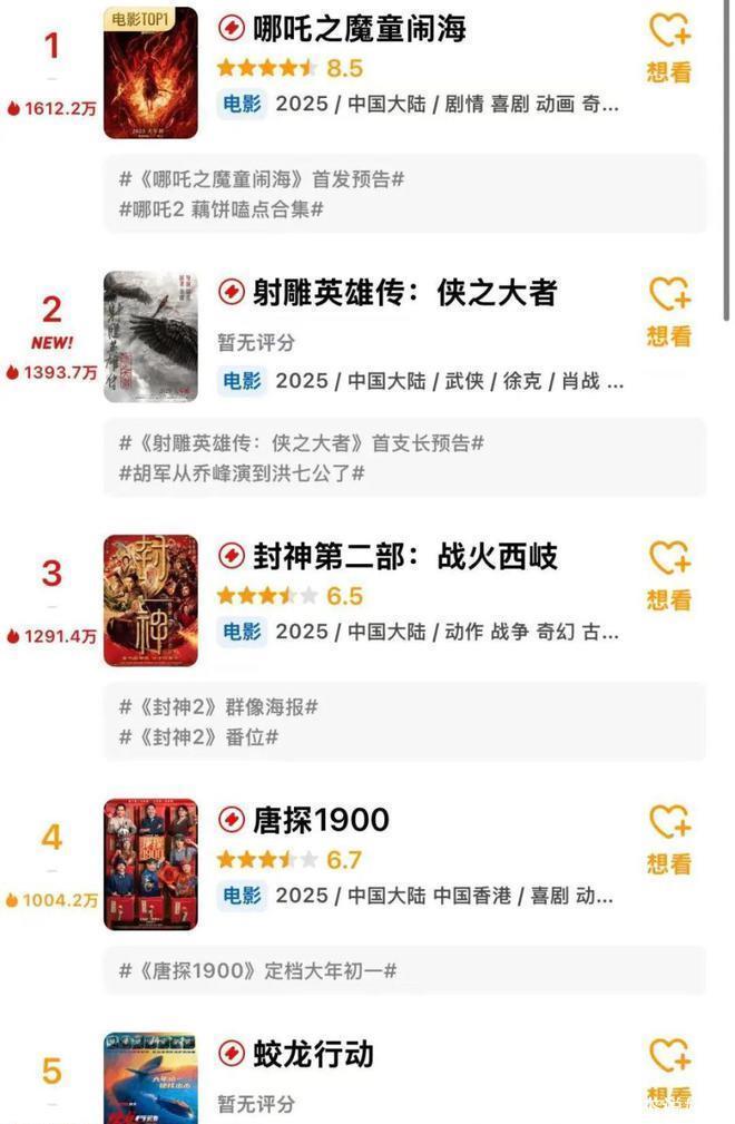 其中现在票房最高的是《哪吒之魔童闹海》,含预售票房已超9亿。屡次在春节档得到佳绩的“唐探系列”,本年通常得益可以,《唐探1900》票房破8亿。也曾创造暑期档票房遗迹的“封神”系列第二部,《封神第二部:战火西岐》5.7亿元,预售领跑的《射雕枭雄传:侠之大者》4.48亿元,不雅众盘牢固的《熊出没·重启异日》破2亿元,档期中的“抢跑”选手《蛟龙行径》天然排行垫底,但通常破亿。