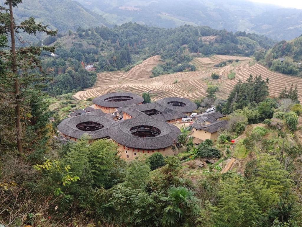 离承启楼约半小时车程的另一处闻明的土楼群,就是漳州南靖县的土楼群。南靖土楼所处位置更深,但不错窥见土楼更多元的样子。其中最闻明的,就是“四菜一汤”的田螺坑土楼群。