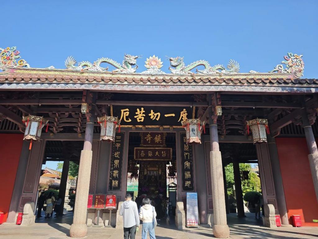 步入寺内,唐代石经幢上的梵文隐隐可辨,宋代的木构斗拱如凤凰展翅,元代的陨石香炉静立檐下。大雄宝殿前,两株南宋菩提树已亭亭如盖,枝杈间筛落的阳光,穿越千载。潮汕独有的嵌瓷工艺,让底本颜色单调的屋檐雕镂,变得涉笔成趣,如游龙戏凤。