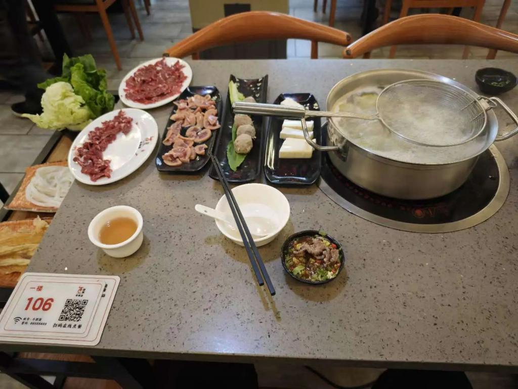 夜晚,牛肉暖锅的江湖在此欢娱,脖仁雪斑纹如大理石,匙柄肌理透如琉璃,沙茶酱的咸甜勾出肉香,方知潮东谈主“火头解牛”的功夫已臻化境。