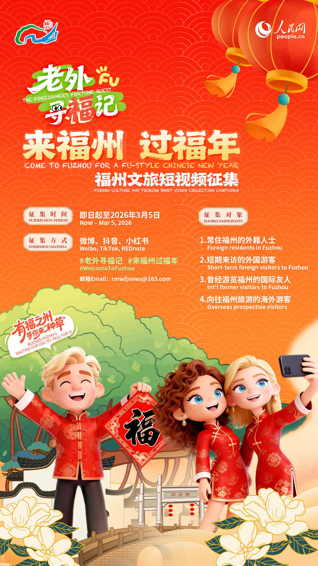 参与方式也很肤浅,在微博、抖音、小红书带话题#老外寻福记#或话题#来福州过福年#发布短视频,即可参与活动。虽然,也迎接你在个东谈主国外应对账号共享你与福州的故事,并将视频发送至邮箱:rmwfjnews@163.com。