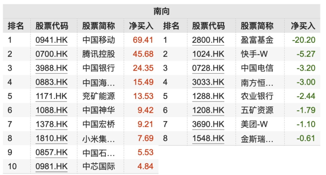 当年7天,南向资金净买入金额较多的方向为中国移动、腾讯控股、中国银行、中国海洋石油,兖矿动力。当年7天,南向资金净卖出较多的方向为盈富基金、快手-W等。