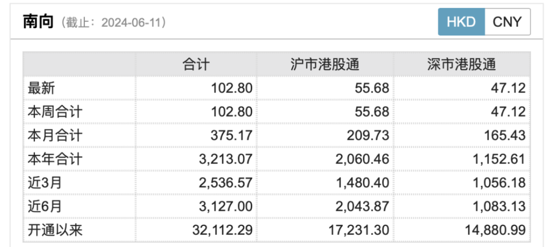 数据透露,6月11日,南向资金净流入港股102.80亿港元。2024年以来,截止6月11日,南向资金已累计流入港股3213.07亿港元。截止6月11日,南向资金照旧勾搭18个来回日净买入。