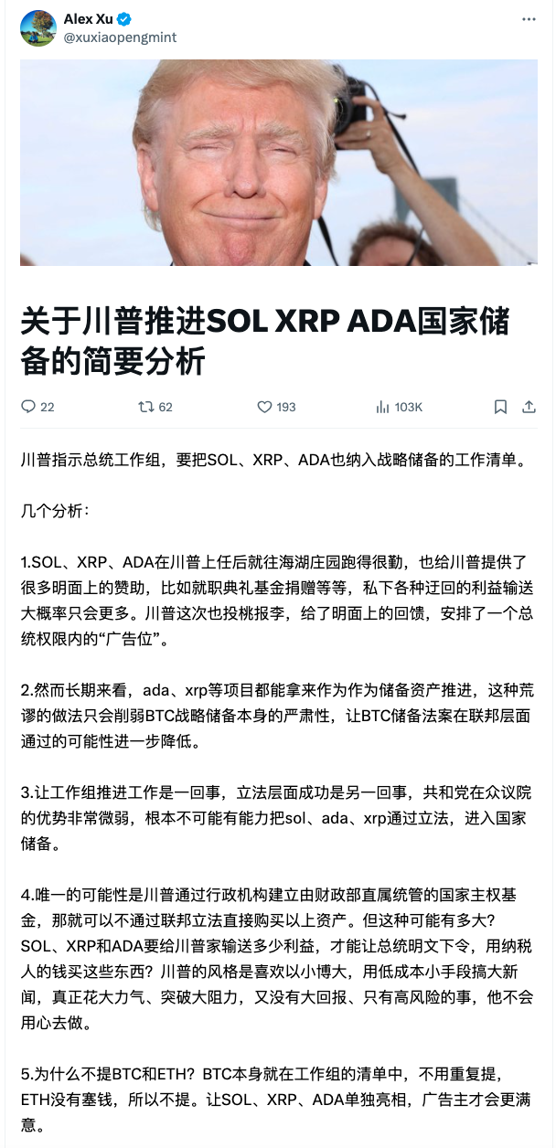 Mint Ventures 研究结伙东谈主 Alex Xu 也第一技能在 X 上发文对此事进行了分析。在他看来,这次特朗普贯注说起 SOL、XRP 以及 ADA这三个盗窟币,骨子上是一种“投桃报李”的行径,因为这三个时势在特朗普上任后,只是在明面上,就赐与了多数包括资金在内的相沿,是以特朗普才诈骗我方的总统权限为它们打一波告白。但思投入立法层面,根底即是不可能的事。Alex Xu 默示,“长久来看,ada、xrp等时势都能拿来动作动作储备钞票鼓舞,这种造作的作念法只会松开BTC计谋储备本人的严肃性,让BTC储备法案在联邦层面通过的可能性进一步缩短。”