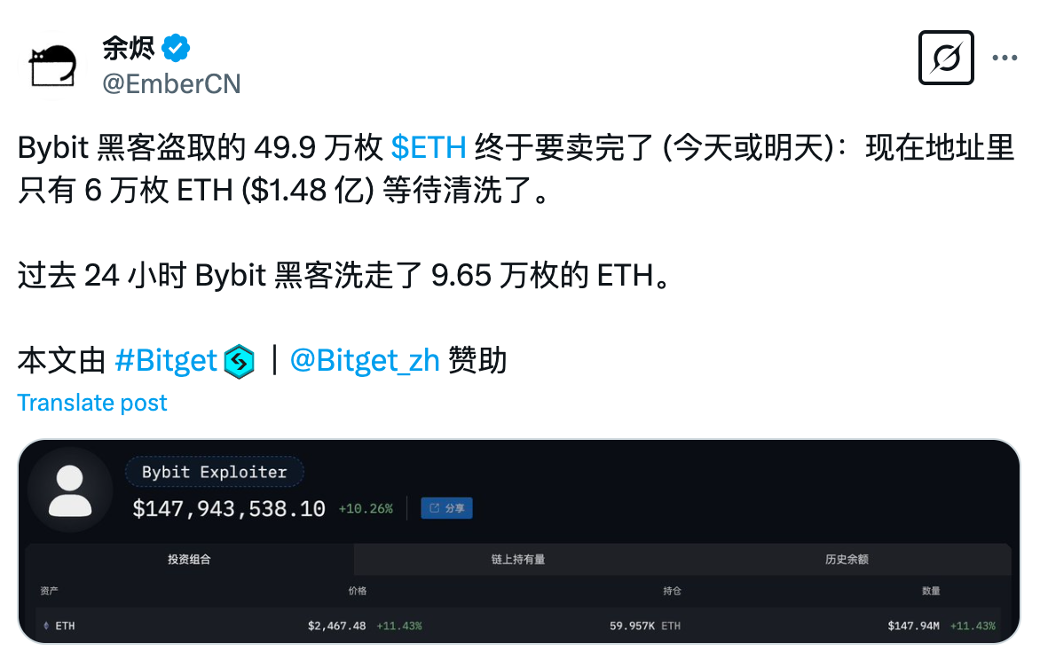 但值得看重的是,Bybit 黑客盗取的 ETH 仍然有一部分未被清洗。据链上数据分析师余烬本日上昼发文默示,Bybit 黑客盗取的 49.9 万枚 ETH 或将至今、明两天通盘洗完,现时地址里唯有 6 万枚 ETH (约合 1.48 亿好意思元)恭候清洗。往日 24 小时 Bybit 黑客洗走了 9.65 万枚的 ETH。