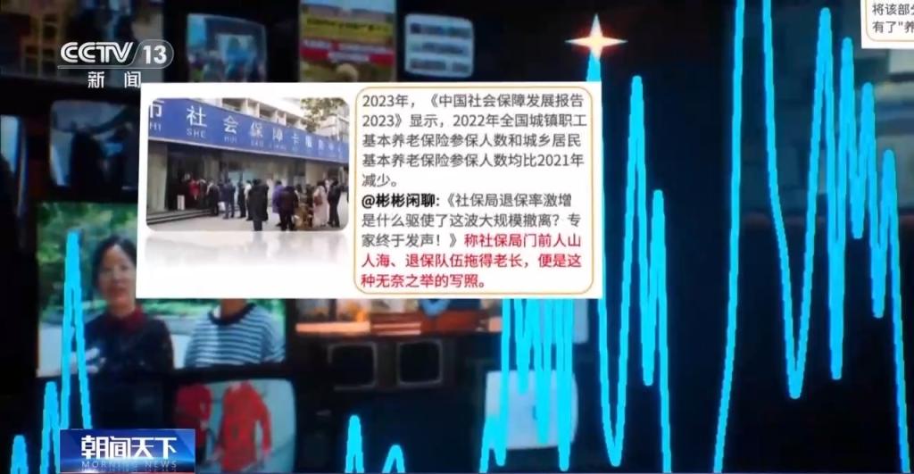 咱们在时刻线上归附这些音问的演变经过。伊始是《中国社会保障发展证实2023》中提到个东说念主待业金缴存比例仍不高。自媒体账号却从中索要出了“参保东说念主员减少”;配上了一张东说念主社部门平淡管待的图片;内容加工成“社保局门前东说念主山东说念主海、退保戎行拖得老长”。每一个强迫出来的爆点,王人“成功”引起了公论的关注。
