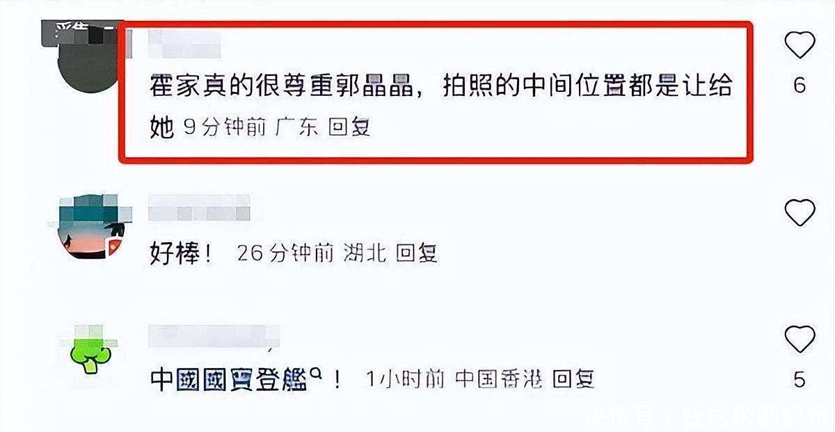 在最终的合影构图中,霍家两位男士仿佛防守者般,一左一右地站在郭晶晶身旁,这么的站位安排显得既天然又言不尽意。