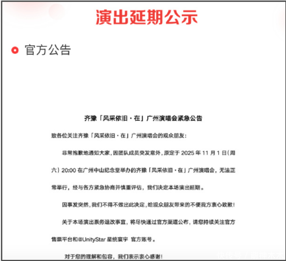 歌手皆豫原定在11月1日在广州举办演唱会,但因团队成员突发恐怕世博体育(中国)官方网站,告示临时取消,激勉了热议,之后有爆料称,皆豫演唱会音乐总监屠颖凄凉离世了。