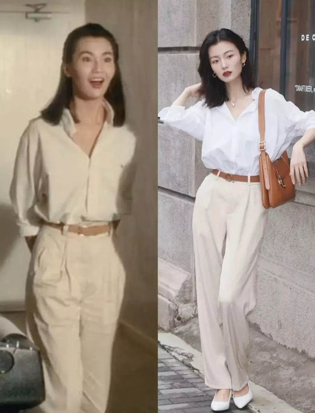 2、白衬衫+米色失业裤这一套是张曼玉在《流金岁月》的穿搭,有种常识分子的氛围感。放到现时亦然不会落后的搭配,至极干净、利落。右图是一位前锋博主的仿搭,在此基础上,搭配一对白色的高跟鞋。配饰接纳了地面色的腋下包和腰带,博主还搭配了一条清雅的项链和一对耳饰。这么从举座上来看就会显得有若干当代点,固然,若是你不心爱穿高跟鞋。那换成浅口鞋亦然可以的接纳,为了让举座更联接,颜料最佳跟裤子或上衣呼应。