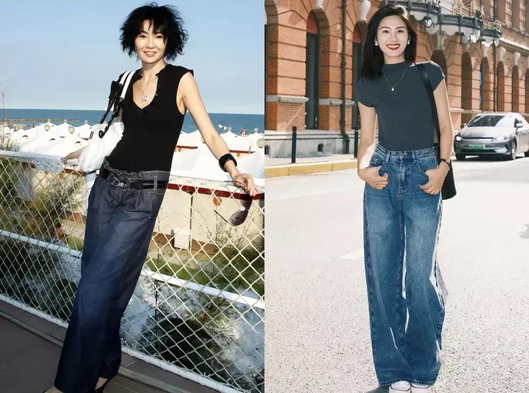 二、来自早期张曼玉的灵感穿搭1、短上衣+牛仔阔腿裤张曼玉在2010年在威尼斯电影节时间的穿搭,上半身穿了一件玄色的坑条无袖上衣,搭配一条蓝色的牛仔阔腿裤和一对玄色的浅口鞋。要不是张曼玉颜值相比高,否则这个发型,我敬佩大深广东谈主皆独霸不了。整套穿搭欺诈了上短下长、相宜留白的穿搭工夫,腰带把悉数这个词腰围展现出来了。是以,咱们可以凭证张曼玉给出的灵感,来诊疗一下这套穿搭。比如,可以像上方图右那位女生雷同。穿一件灰色中低领上衣,搭配一条高腰牛仔裤、帆布鞋。高腰把腰线的位置擢升了,体魄比例更好。
