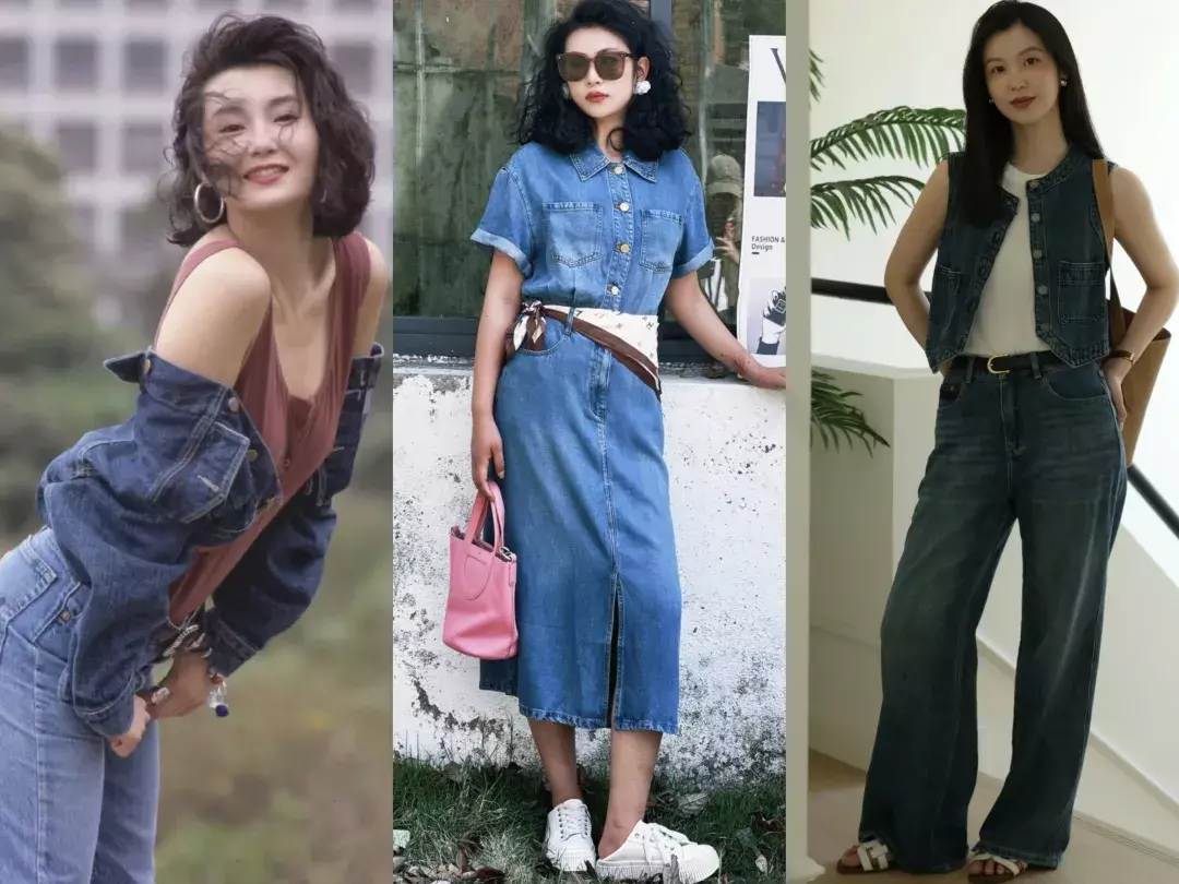 3、牛仔穿搭牛仔面料一直皆是港风穿搭内部很经典的元素,跟圆圈耳饰、浪潮头、大红唇是相得益彰的搭配。在好多港剧内部,皆可以看到牛仔材质的穿搭。上图,张曼玉穿了一整套牛仔套装,内部搭配一件暗玫红色背心,守旧风扑面而来。全球可像上高洁中间图那位女生雷同,穿一条牛仔套装裙子。在腰间系一条丝巾,把腰围展现出来;或者像右边那位女生,搭配一整套的守旧牛仔套装,马甲内部可以穿一件白色T恤当内搭,守旧又耐看。