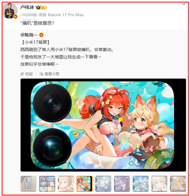 小米的卢伟冰也暖和到了这事儿,还在酬酢媒体上问 “‘痛机’是啥原理?”。网友们看到后,在探求里忍不住捉弄他,说卢总别总盯着宣传背屏的便利贴和信息指示功能了,其实后置自拍、追星时用来展示偶像、搞二次元痛机,这些才是背屏的最大卖点。