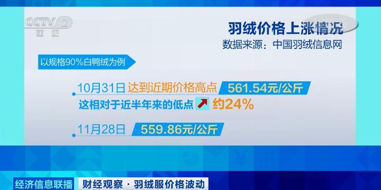 记者查询中国羽绒信息网发现,第四季度以来,灰鸭绒和白鸭绒的价钱涨幅较为理解。以规格90%白鸭绒为例,10月31日达到近期价钱高点,为每公斤561.54元,这相干于近半年来的低点高涨约24%。据最新数据,11月28日,该品类价钱为每公斤559.86元。(央视财经)举报/响应