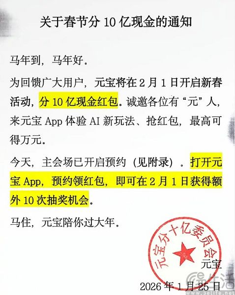 腾讯元宝方面告示将于2月1日上线春节行动,用户上元宝App即可分10亿元现款红包,单个红包金额可达万元。百度文心助手则示意,自1月26日至3月12日,用户在百度App使用文心助手就有契机分5亿现款红包,单个红包最高可达1万元。