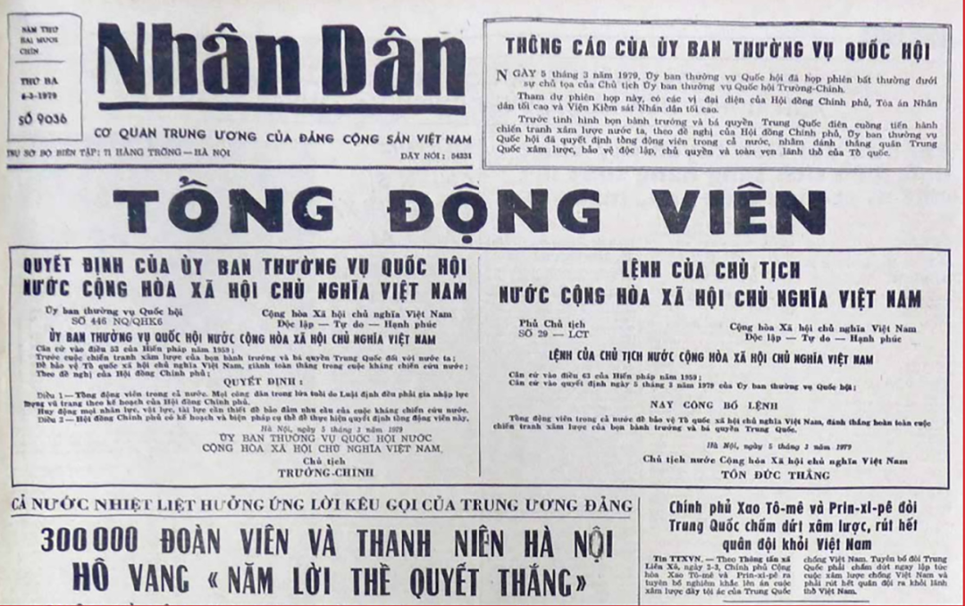 3月4日,越共中央先发号召:“世界同族起来保卫故国,老小男女东说念主东说念主皆兵。”第二天一早,《越南之声》电台运行反复播报。国会常务委员会梗阻开会,一致通过总动员决定,孙德胜署名,端正收效。